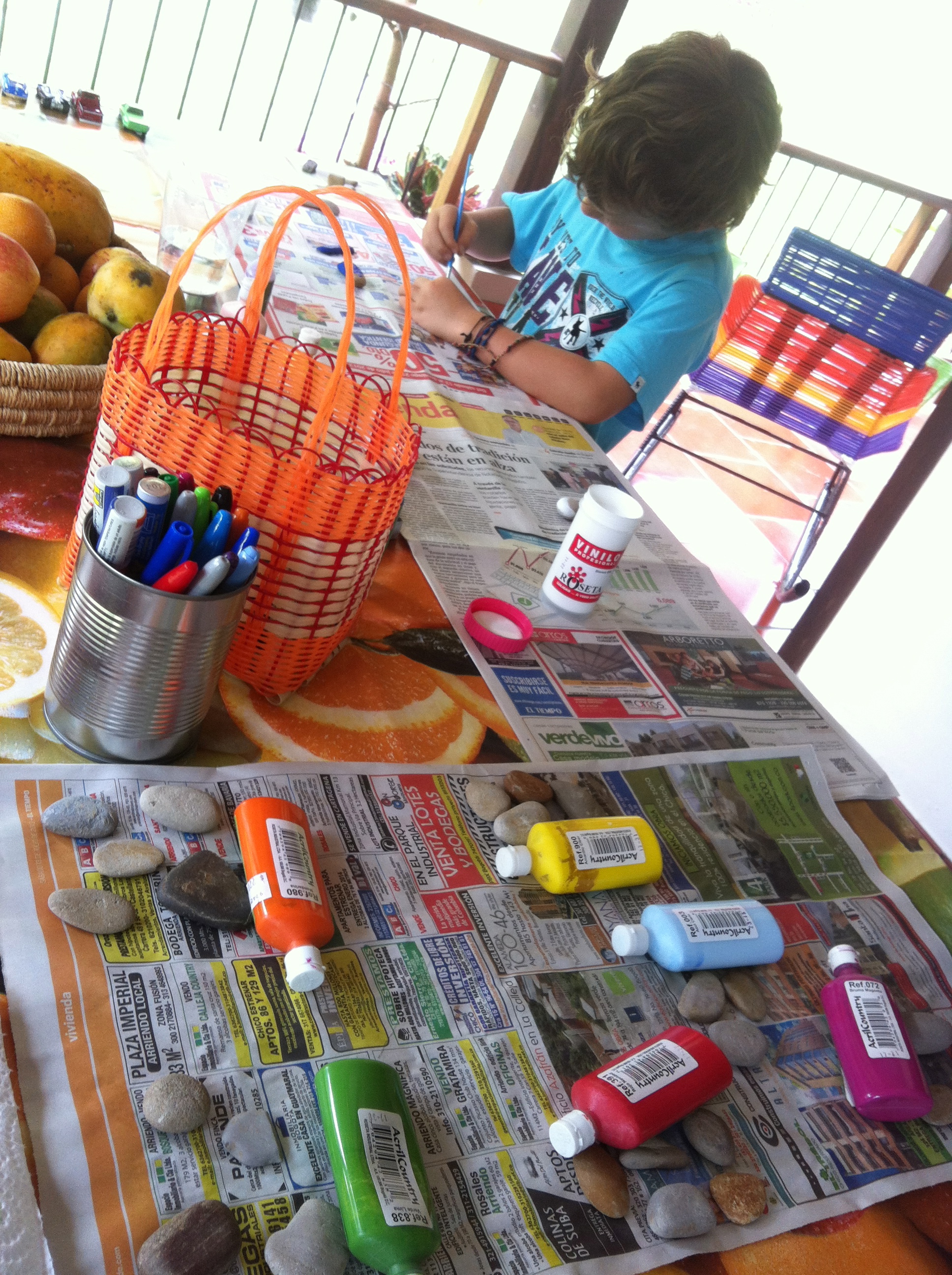 Para que no se aburriera mucho de su mamá y sus ideas locas, y para que le parara un poco al iPad y a la frase «no sé qué hacer» o «estoy aburrido», un día o dos estuvimos pintando rocas y fue una experiencia maravillosa, creativa y que nos unió mucho. Aquí les muestro el paso a paso: