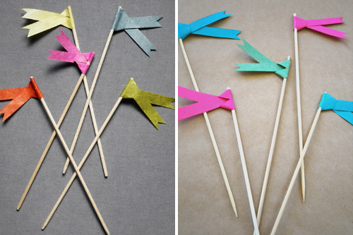 Una manera fácil y económica de adornar una mesa son estos banderines, que se pueden ubicar en la comida, en las bebida o como decoración todos juntos. Además, en el banderín se puede escribir -por ejemplo- lo que se sirve en la mesa: bebidas, muffins, pasabocas, etc. Los colores harán que la mesa luzca hermosa.