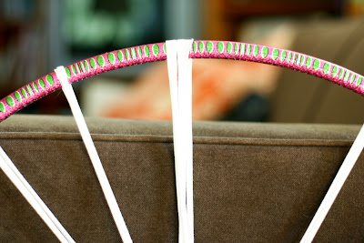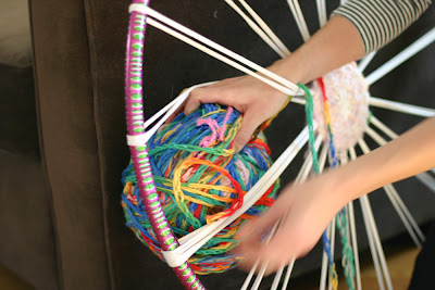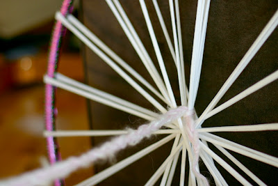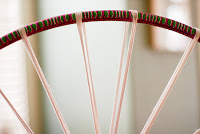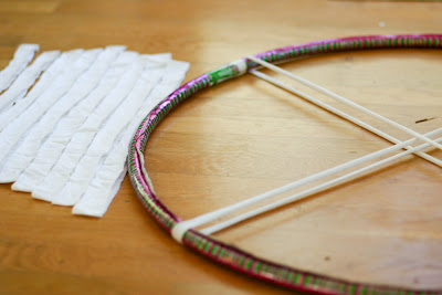 Comenzamos a ubicar las tiras en el hula hula -como haciendo los radios de una bicicleta-, pasando progresivamente entre los radios que ya hemos agregado.