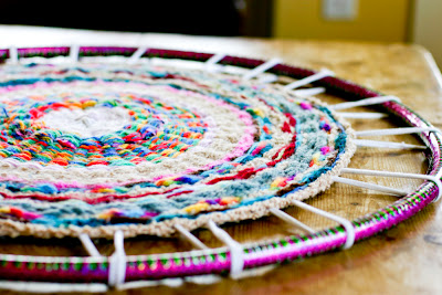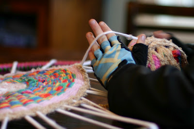 Una manera fácil de ir tensando el tejido es hacer una o dos vueltas y tirar (no muy fuerte) para que vaya ajustándose la lana o el tejido contra el círculo y no quede huecos.