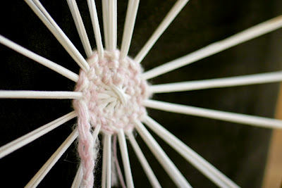 Ahora con la bola de tejido de croché o con lana normal, lo que hayan decidido, hacemos un nudo en el centro de uno de los radios. Se puede comenzar con el duplicado para ya tenerlos como uno solo.