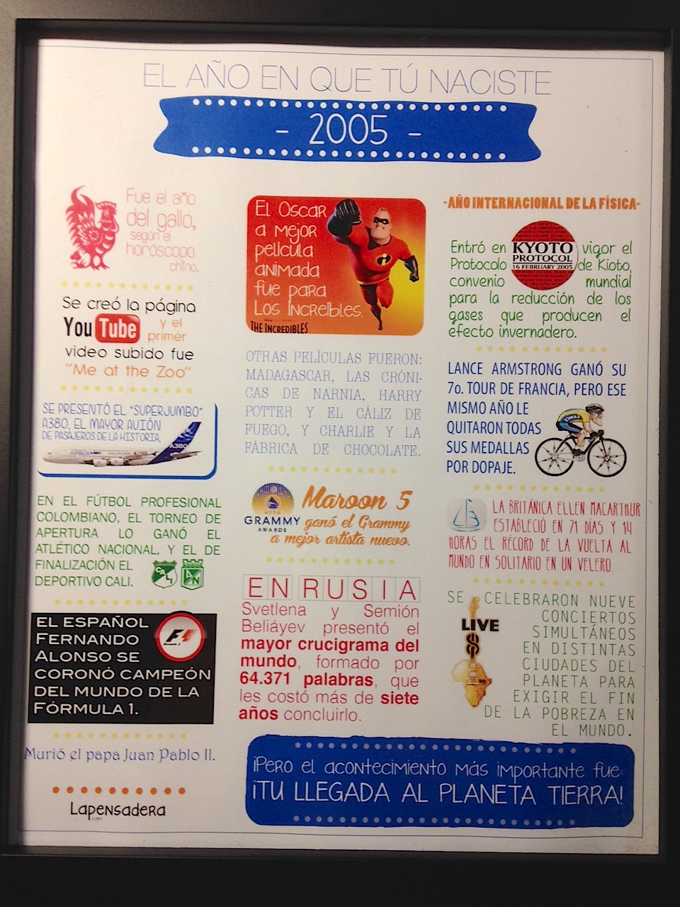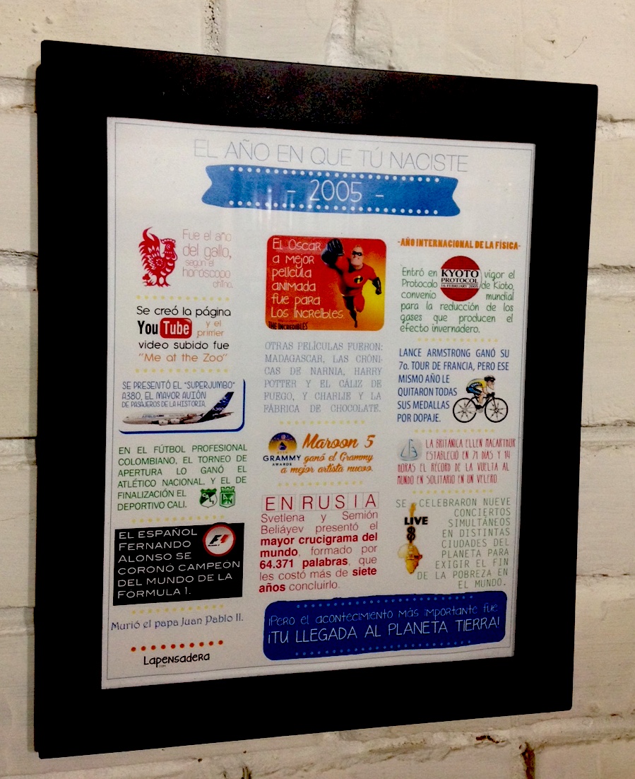Así que, desde hace como un año venía con esta idea para otra cosa: hacerle a mi hijo un cuadro con los sucesos más importantes del año en que nació. Me parecía algo especial, que supiera que en el año de su nacimiento pasaron hechos históricos, para no olvidar.