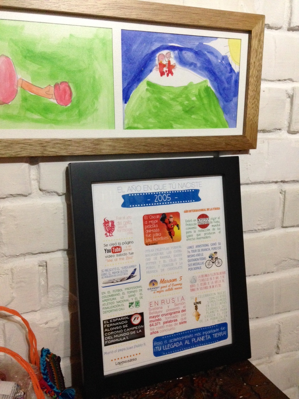Sería un buen regalo para cualquier niño o niña pequeños, o hasta grandes (no muy grandes, ¿eh? que yo no quisiera que me recordaran mi año de nacimiento, del siglo pasado!). Pero para un bebé de un año, cinco, diez, quince! recordar eventos importantes de esa época, para adornar su cuarto, sería un hit! O al menos eso me dijeron los cumpleaños que recibieron este regalo.
