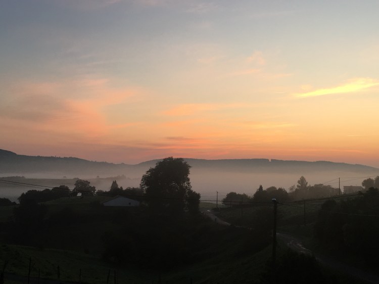 Aunque el camino fue asfaltado, todo el tiempo hubo campo: sembrados de maíz, vacas y hasta una iglesia muy antigua. Estuvo lindo eso. Lo malo fue que comenzó a dolerme la pierna… qué piedra… menos mal me faltaba poco; bajé el ritmo y llegué.