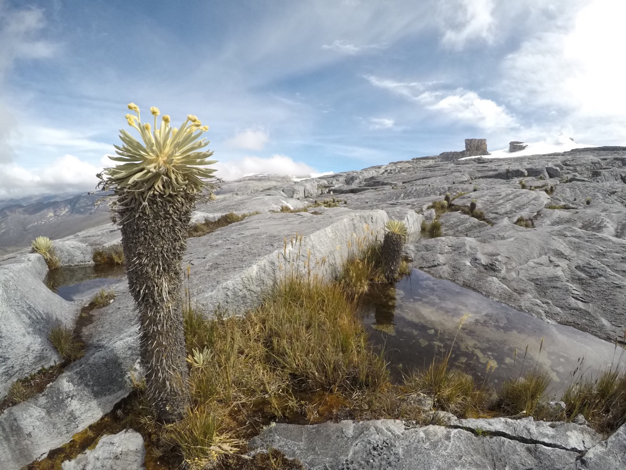 Lo primero que nos encontramos, como lo digo en el podcast, es el hermoso valle de Lagunillas… ver esos frailejones desde la cima en la que estábamos, tapando el valle como un tapete mullido es una belleza. Recuerdo que algunos que vimso estaban aún con hielo de la helada de la noche anterior: buen augurio de día despejado, como también nos lo hizo saber el cielo.
