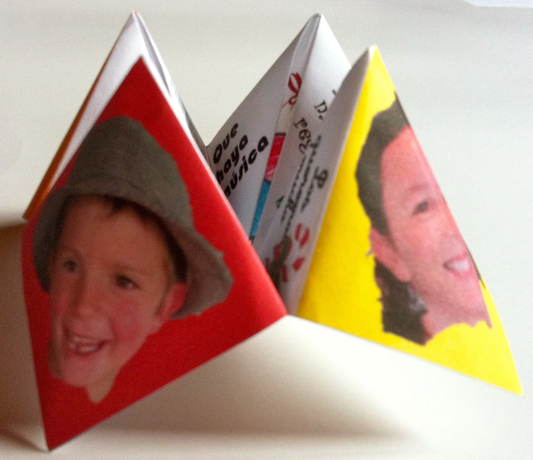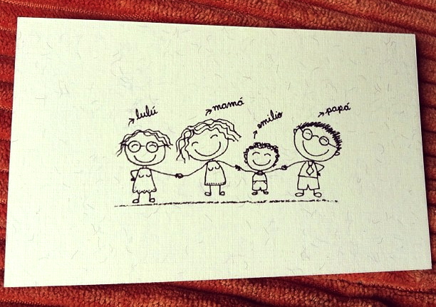 La tarjeta de visita trae los datos importantes de casa (celular de papá, mamá y un mail), y el dibujo de la familia en pleno.