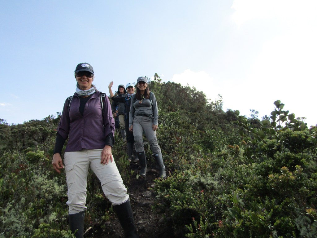 Nos volvemos a internar por un bosquecito hasta llegar a la quebrada El Uval, pasamos al otro lado de ésta y seguimos en ascenso por una trocha ya más abierta, que nos permite disfrutar del paisaje a lado y lado de todas las montañas que nos rodean. Un poco más adelante paramos a merendar: les hemos traído a nuestros caminantes una mezcla de nueces y semillas para tener energía en esta hermosa mañana que cada vez abre más y nos deja ver el cielo azul tan esquivo en el páramo.