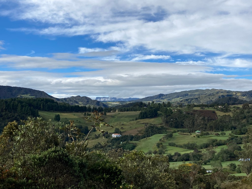 En este punto comenzamos nuestro descenso, por otro hermoso sendero y otra montaña que nos lleva por un jardín de frailejones, puyas y estrellitas de páramo, cuyo nombre científico es “Paepalanthus alpinus”. De pronto, se nos abre el paisaje azul y verde hacia el valle de Guatavita, a la laguna de Tominé y sus bellos alrededores que parecen una alfombra con todas las tonalidades del color verde.