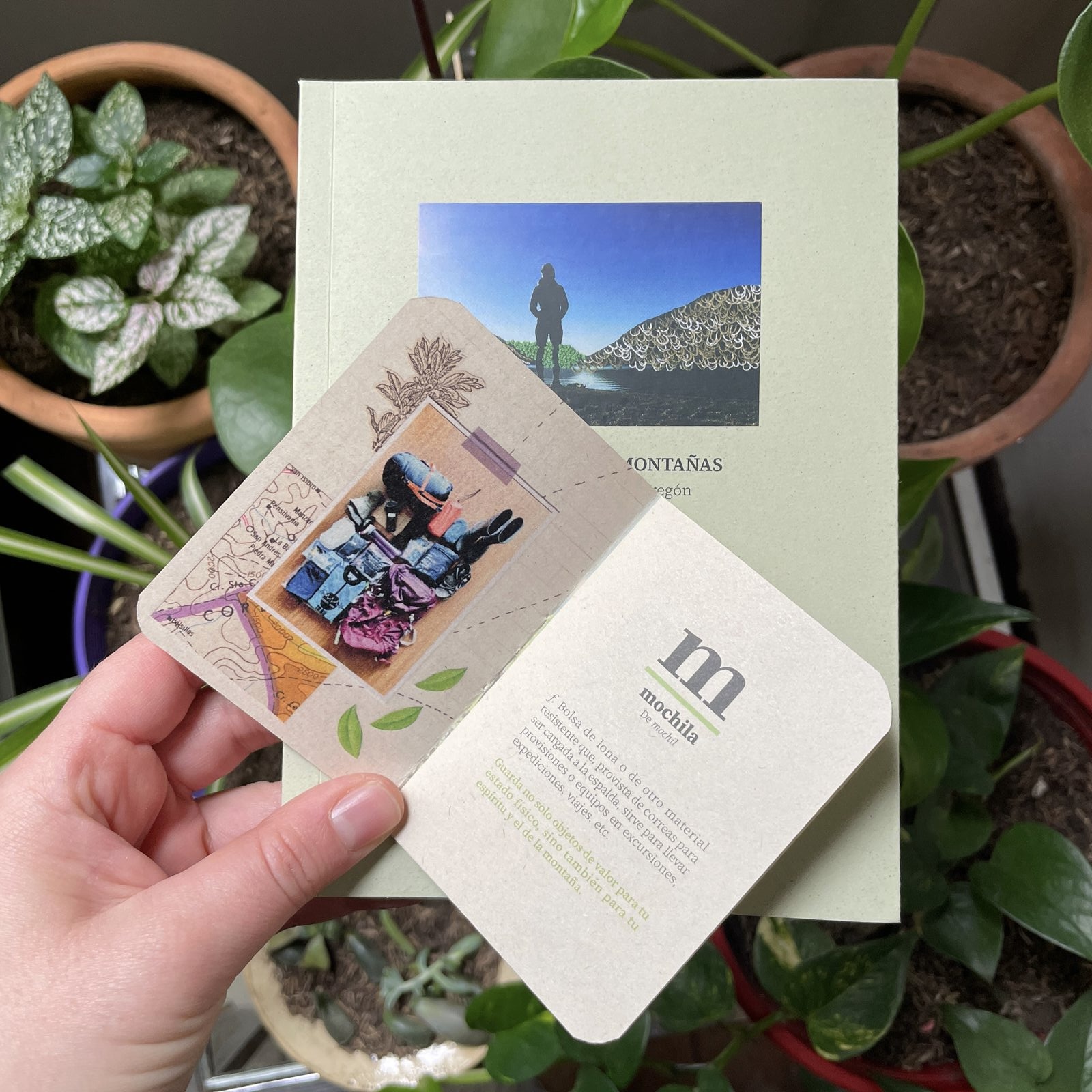 Dentro del libro te encontrarás una «mochila» que es un fanzine en el que te cuento sobre esos elementos esenciales -para mí- a la hora de ir a la montaña: la ofrenda, el amuleto, la oración y el cuaderno.